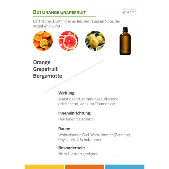 B01 Orange Grapefruit ist ein frischer Duft mit einer leichten, süssen Note. Mit Sicherheit anziehend für Jedermann oder Jedefrau.