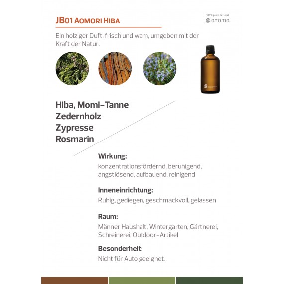 JB01 Aomori Hiba ist ein holziger Duft, der frisch und warm ist, umgeben mit der Kraft der Natur. Männer werden ihn lieben.