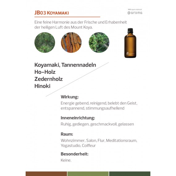 JB03 Koyamaki ist ein japanischer Duft. Koyamaki ist ein Nadelbaum, der durch seine besondere Frische auszeichnet. Dieser Duft ist somit eine feine Harmonie aus der Frische und Erhabenheit der heiligen Luft des Mount Koya (Weltkulturerbe).