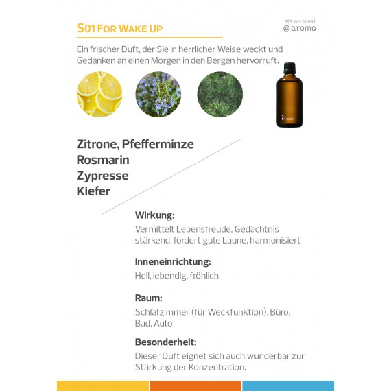 S01 For Wake up ist ein frischer Duft, der Sie in herrlichster Weise weckt und Gedanken an einen Morgen in den Bergen hervorruft.