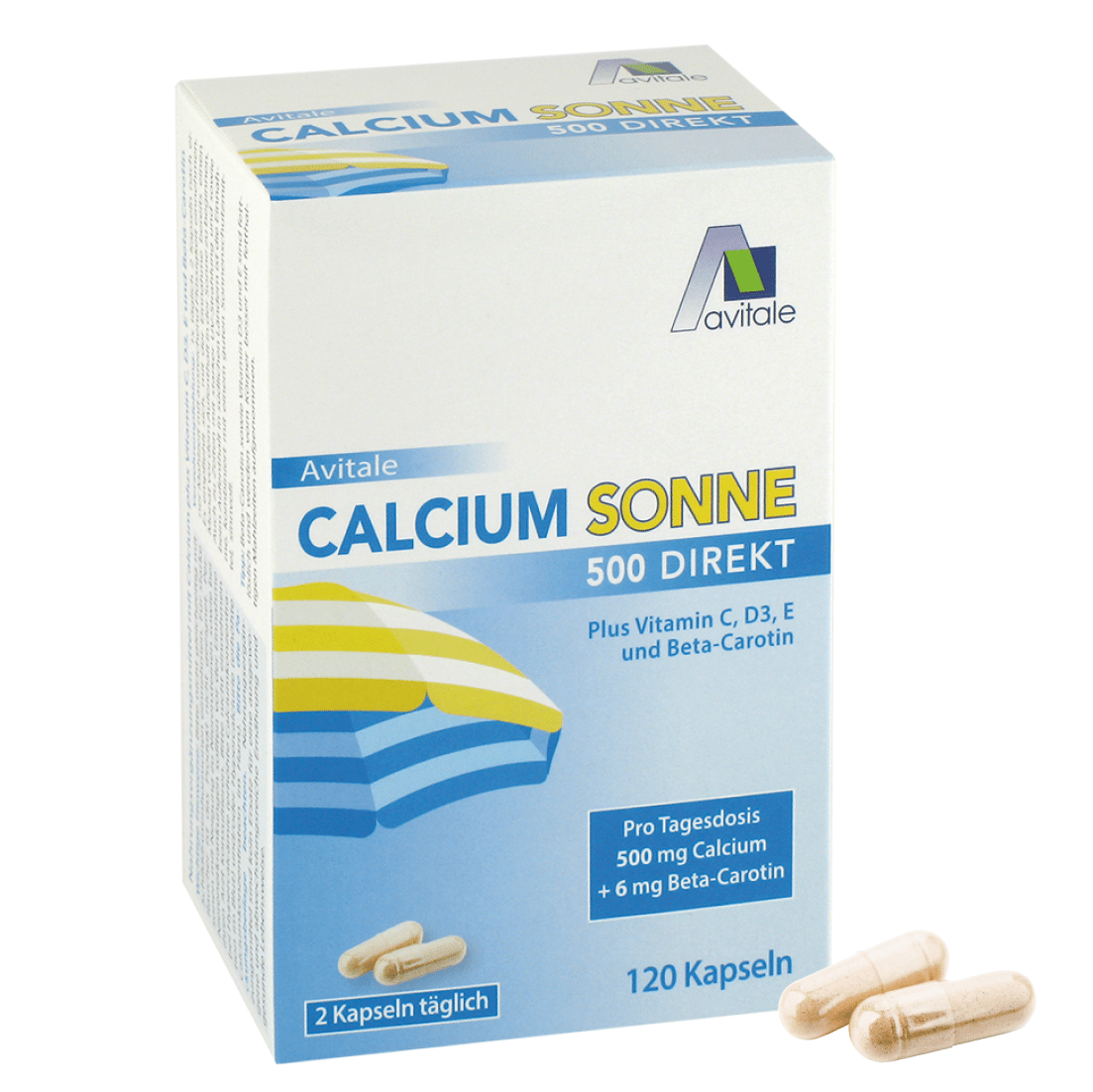 Avitale CALCIUM SONNE ist eine Nahrungsergänzung auf Basis von Calcium, Beta-Carotin sowie den Vitaminen C, D3 und E.
