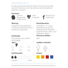 Der Zitronenhain-Raumduft ist geprägt durch Frische im Raum. Zudem steigert er die Konzentrationsfähigkeit und gibt Ihrem Raum eine Prise Humor, um in den diversen Arbeitssituationen bestehen zu können.