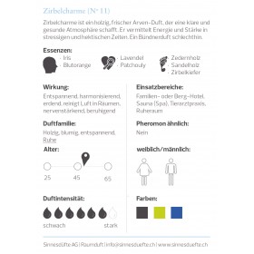 Der Zirbelcharme Raumduft ist ein holzig, frischer Arten-Duft, der eine klare und gesunde Atmosphäre schafft. Er vermittelt Energie und Stärke in stressigen und hektischen Zeiten. Ein Bündnerduft schlechthin.