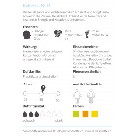 Dieser elegante und leichte Raumduft erfrischt und bringt Fröhlichkeit in die Räume. Bei dicker Luft kühlt er die Gemüter und lässt neue Energie und Kreativität entstehen.