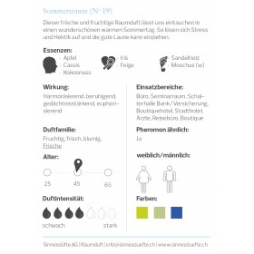 Dieser frische und fruchtige Raumduft lässt uns eintauchen in einen wunderschönen warmen Sonnentage. So lösen sich Stress und Hektik auf und die gute Laune kann einziehen.