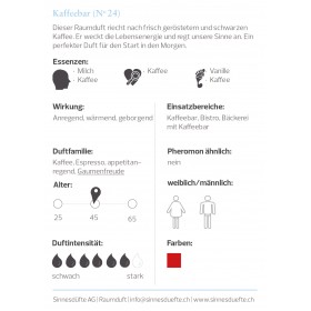 Dieser Raumduft riecht nach frisch geröstetem und schwarzem Kaffee. Er weckt die Lebensenergie und regt Ihre Sinne an. Ein perfekter Duft für den Start in den Morgen.