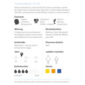 Dieser balsamische, warme Raumduft lässt Stress und Ärger verfliegen. Nach einem aufreibenden Tag wirkt er stimmungsaufhellend, er hilft Ihnen zu entspannen und den Körper zu harmonisieren.